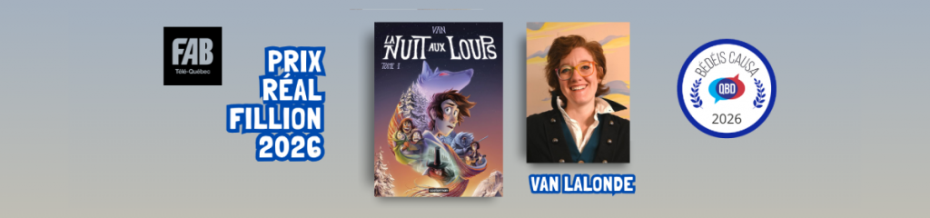 C’est à Marie-Claude Leclerc, coordonnatrice régionale pour FAB Télé-Québec, qu’est revenu le plaisir de décerner la première récompense de la soirée avec le Prix Réal-Fillion, décernée à un·e auteur·ice s’étant le plus illustré·e avec son premier album francophone professionnel. Accompagné d’une bourse de 1 000 $ et d’une capsule qui sera produite par FAB Télé-Québec afin de permettre au public de découvrir son univers, le prix a été remis à l’autrice de Québec Van Lalonde, pour La nuit aux loups (Casterman). Avec ce premier tome plus que prometteur, l’autrice a charmé le jury en offrant un récit historique et fantastique campé à Québec, avec une intrigue captivante, des personnages attachants et un dessin très dynamique.